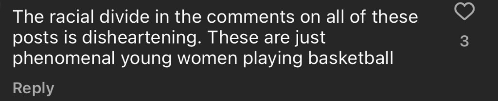 Clark and Reese are examples of two things. 1. The media loves to CREATE a good story about good versus evil, right versus wrong, and Black vs White. 2. The comments on the post reveal a heart posture of racism, unfairness, inequality, sexism, and double standard behaviors. One comment I can’t shake from my memory after the LSU vs Iowa game on Monday was, ” Thanks for saving America Clark.”
